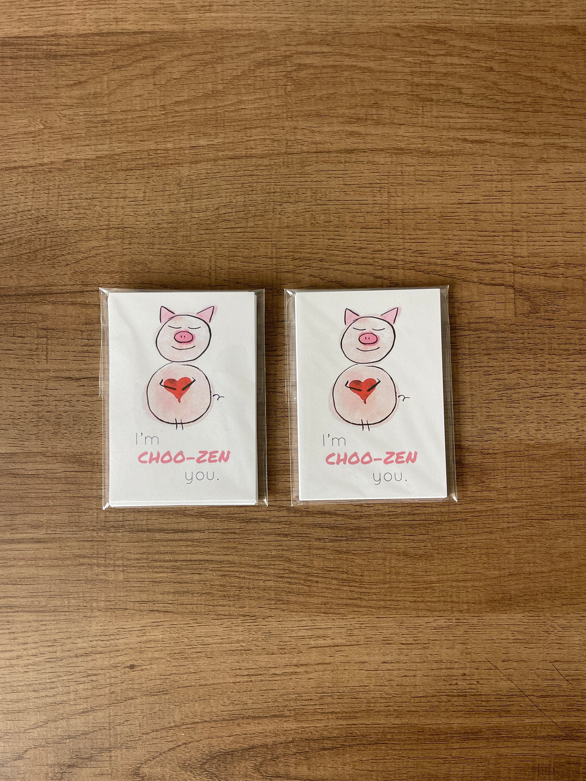 The Zen Pig Valentine’s Card Pack includes 16 adorable cards featuring 8 unique designs — each one filled with playful word-puns and gentle messages of love, friendship, and positivity.